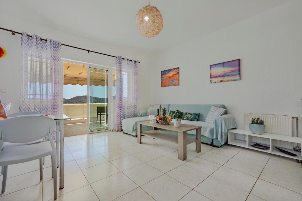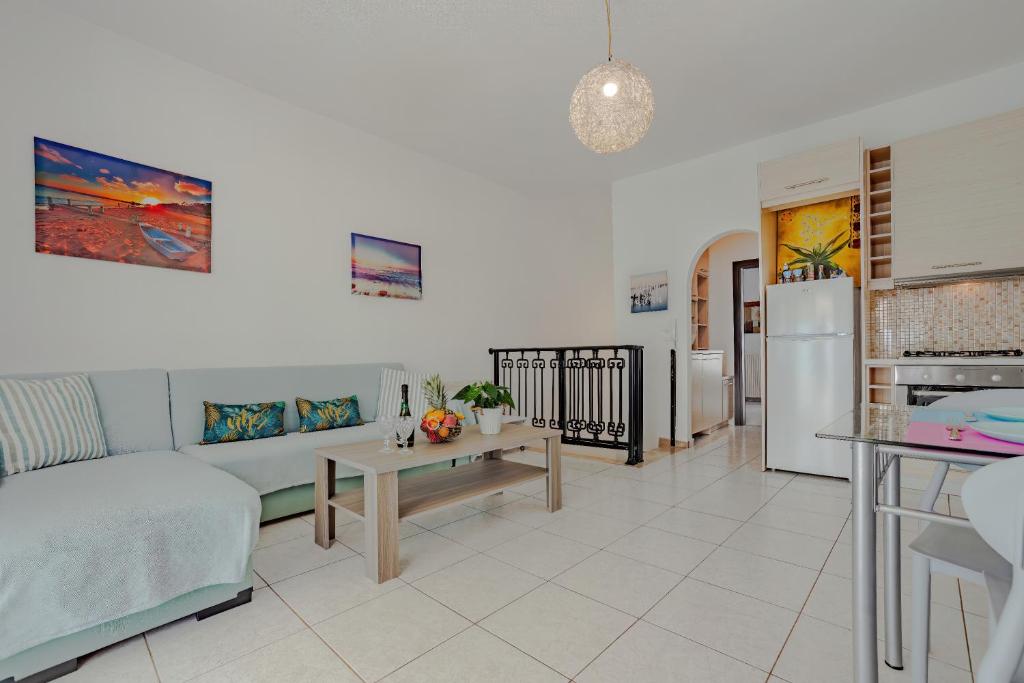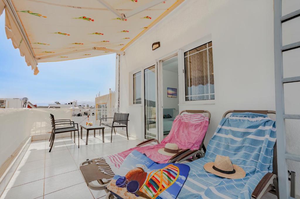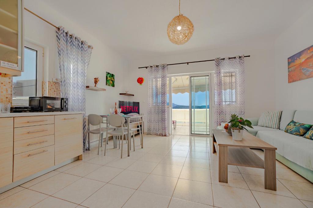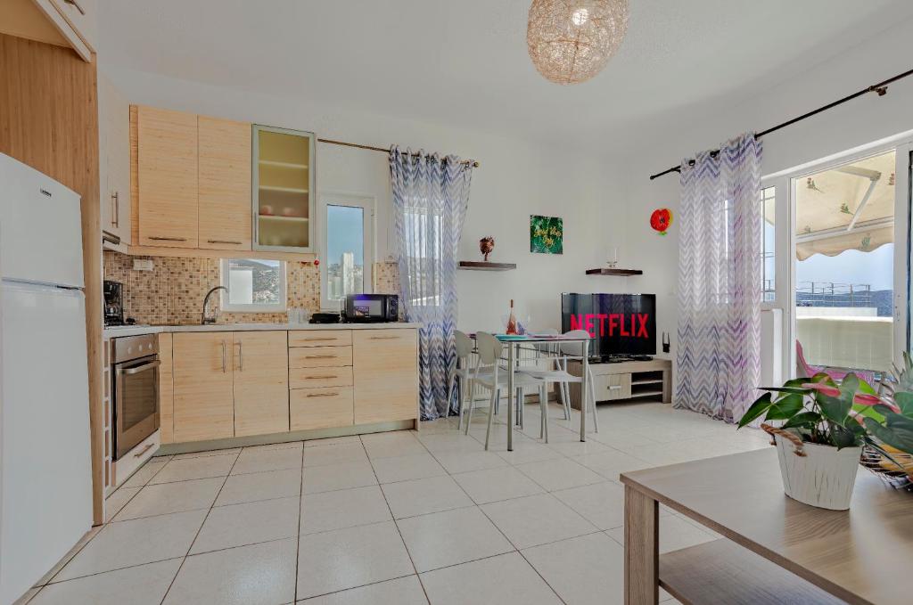 Checking the photos, it looks as though the property is contained on the entire floor, from street to balcony overlooking the sea. The photos in the slideshow below are from the booking.com link above. Use the arrows to scroll through them.