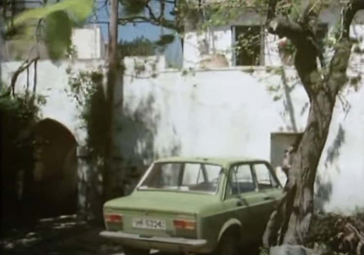 Babis is away, so Haldane goes to rent a car to drive up to the mountains to the olive groves where he fought, and to the Kera monastery. The rent a car company he ends up at (Kafetzakis rent-a-car) was established the same year as the serial was made (1977) and was a less than a minute’s walk from Babis’ office. Note the old building that fills the background in the below screenshot.