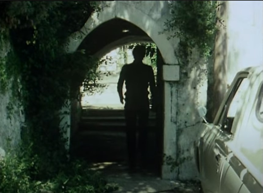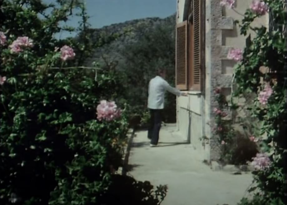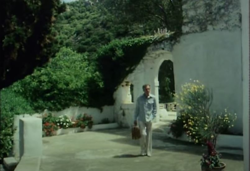 After Haldane looks at the pillbox and photo of Melina, he gets in his car and drives off. Noticeable here is the rock formation in the sea and the white buildings in the distance on the other side of the bay.