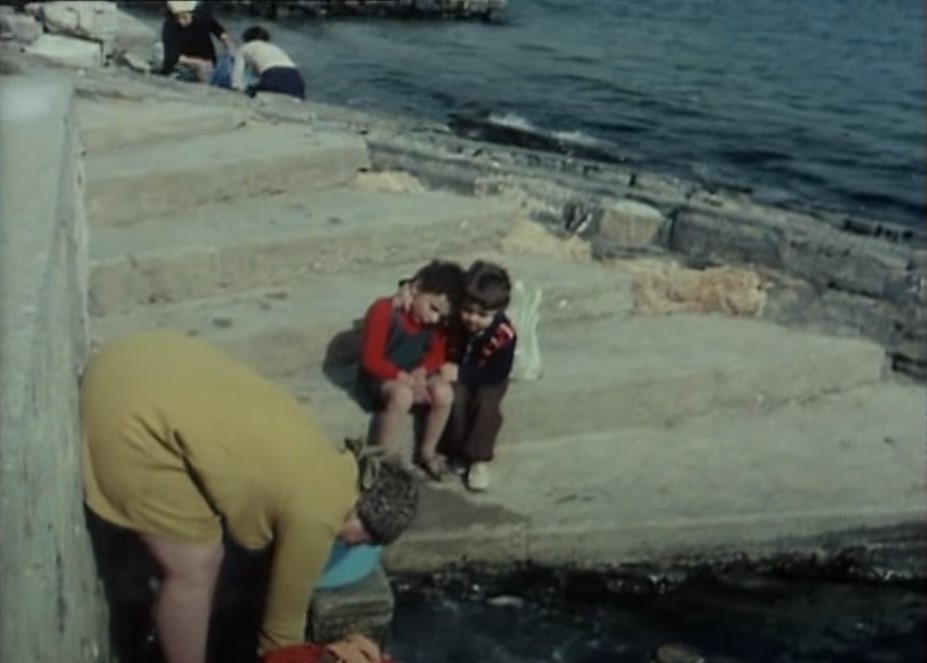 He then reminisces on his past further by driving down to the coast. I’ve located the mountain range behind in the next photo, he’s on the Elounda side of Mirabello Bay looking across it towards Kavousi, most probably from Ayios Nikolaos. I do recall on a past visit to Ayios Nikolaos in the 1980s that there were lots of these rectangular blocks, somehow they largely seem to be gone now.
