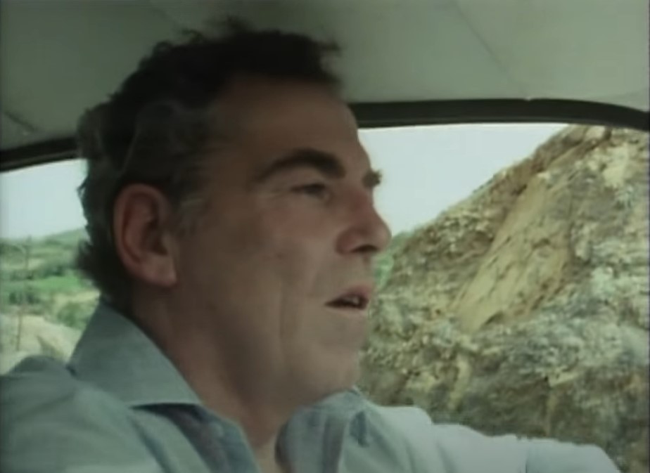 In the next shot, he’s further down the coast. His car is parked south of Ammoudara Beach. Notice the white patch in the mountains across Mirabello Bay to the right of Haldane’s shoulder.