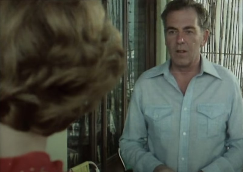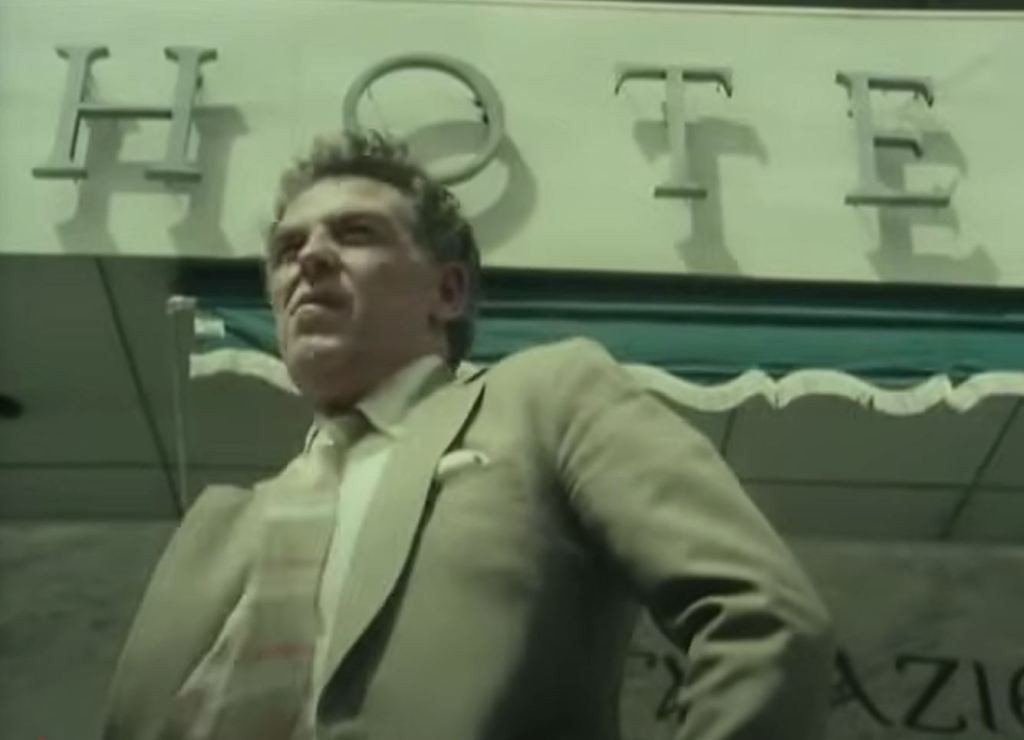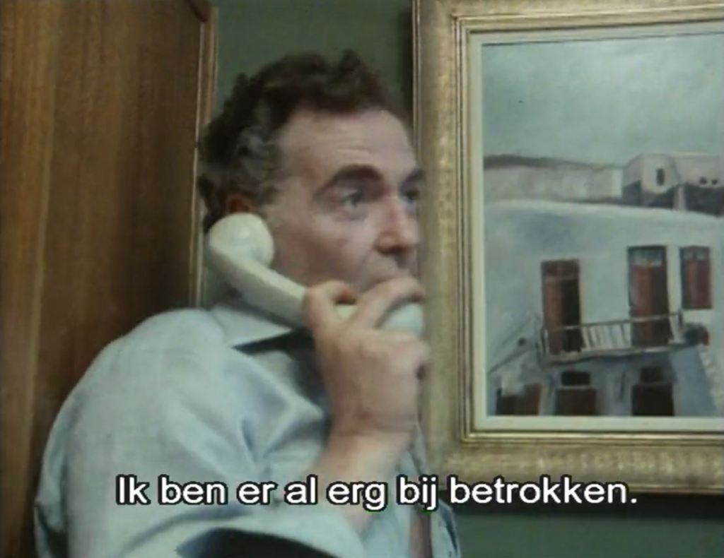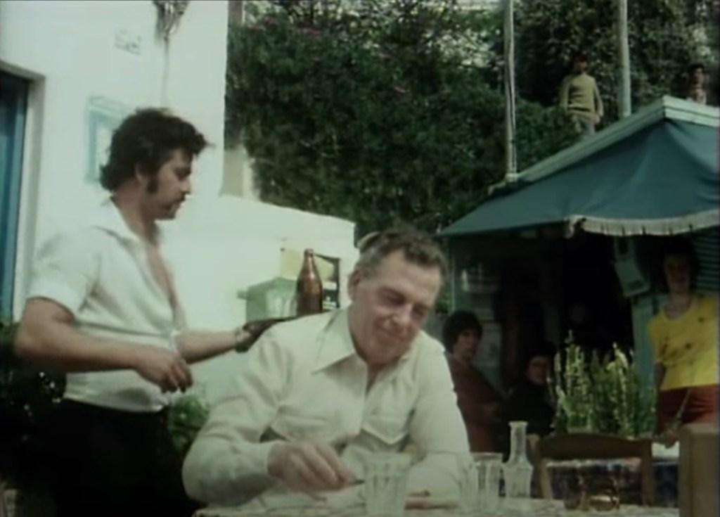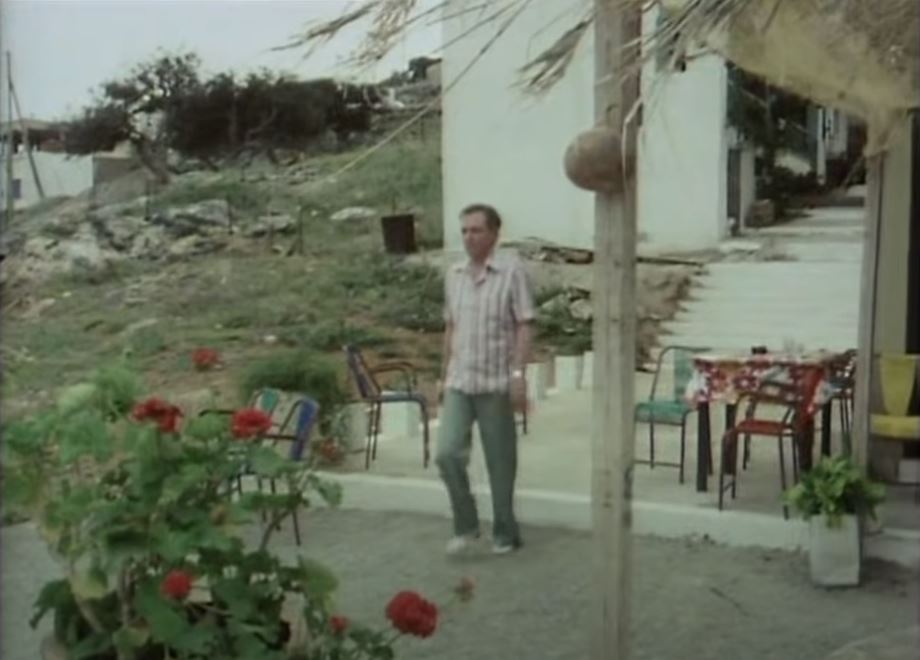 Notice the headboard in the following photo. This doesn’t look like the same hotel room as when he landed in Heraklion, even though the walls are again a slight green colour. The cast and crew were staying in Agios Nikolaos whilst production was under way, so this was probably been filmed there. Checking the scenes of the taverna’s upstairs rooms in other episodes, this doesn’t look like one of those either.