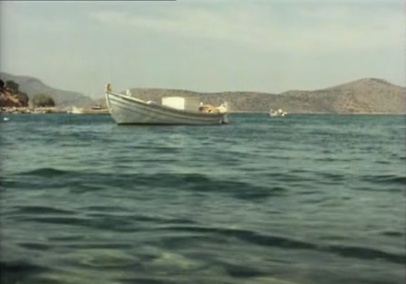 When Haldane meets Babis for dinner and they dance the Pentozali (which is a traditional Cretan dance), they are in a taverna. In the novelisation, this is noted as being in a taverna on the outskirts of Heraklion. However, from speaking to Andrew Morgan, he said that it was in a taverna on the perimeter of Limni Voulismeni, in Ayios Nikolaos. It’s a restaurant the crew ate at whilst there. Note the smooth floor, and what looks like bamboo on the walls behind the crowd, and in the last photo, the patio doors.