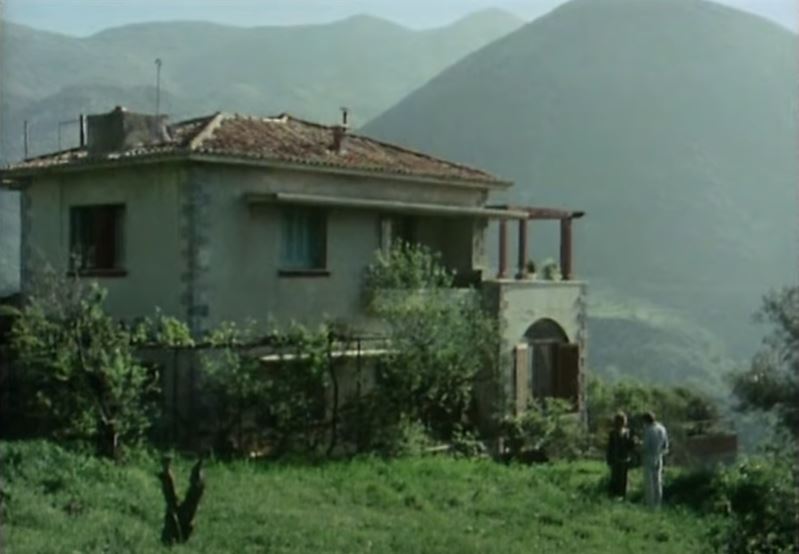 This location looks to be just outside the village of Ano Amigdali, near to the Meligala location from Episode 6. In the screenshots above, Ano Amigdali is the village in the background at the start of the panning shot, with the lone building above the others being Agios Nektarios church.