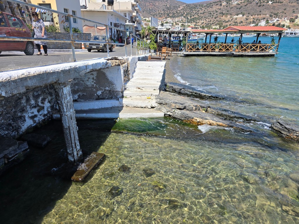 The steps in the screenshot above are located outside the Elounda Coastguard Headquarters. They’ve largely been covered by the extended pedestrian walkway but the bottom two steps are still visible.