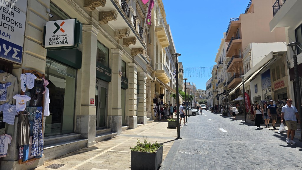 This is located on 25th August Street, walking southbound. In the shot above, Babis’ office is where the Doric columns are just after the Budget rent-a-car. Where Budget was, is now a branch of Chania Bank.