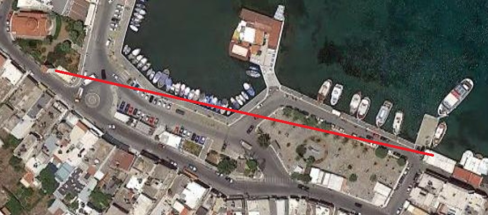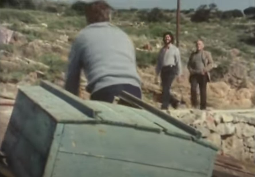 This is the same location as the beginning of the episode. The Despina Taverna is visible in the distance. The stone wall (marked) is a feature that is still there next to the Taverna. The road is visible above the boat.