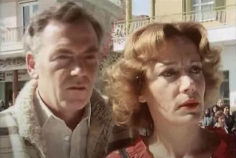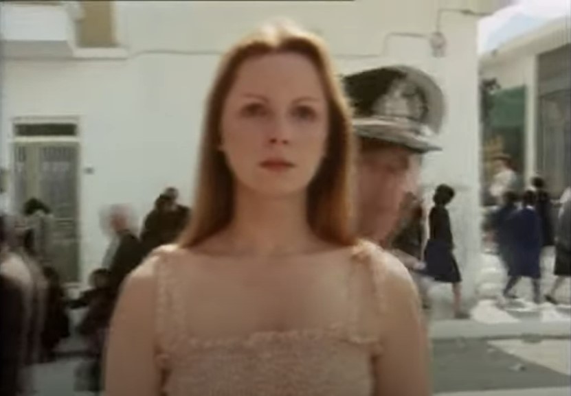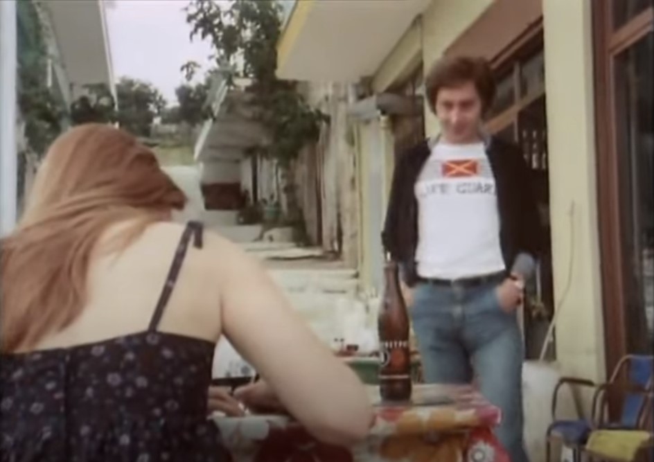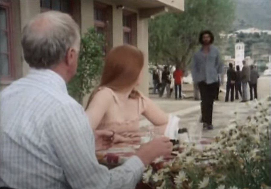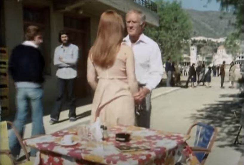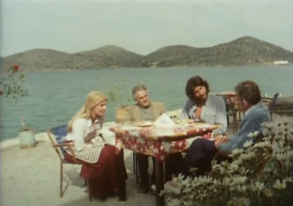 In the next shot of Jo you see the church bell tower in the background, so they’re sat at a restaurant beside Elounda Square, which is what would now be Megaro restaurant – the first one on that strip.