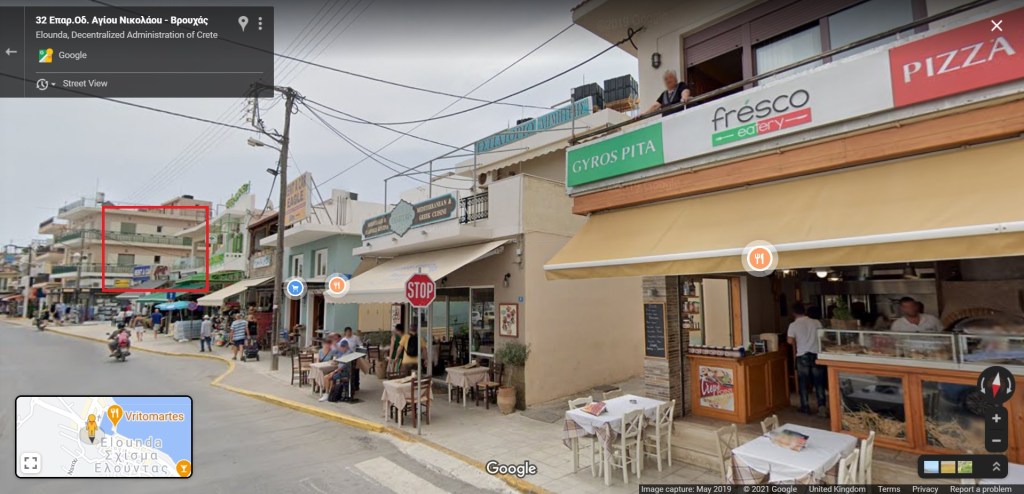 Haldane is staying at Babis’ apartment in Elounda. This is conveniently located in the alleyway beside the taverna. This is also where Babis parks his maroon BMW across the alleyway on the main road at the top of the stairs.