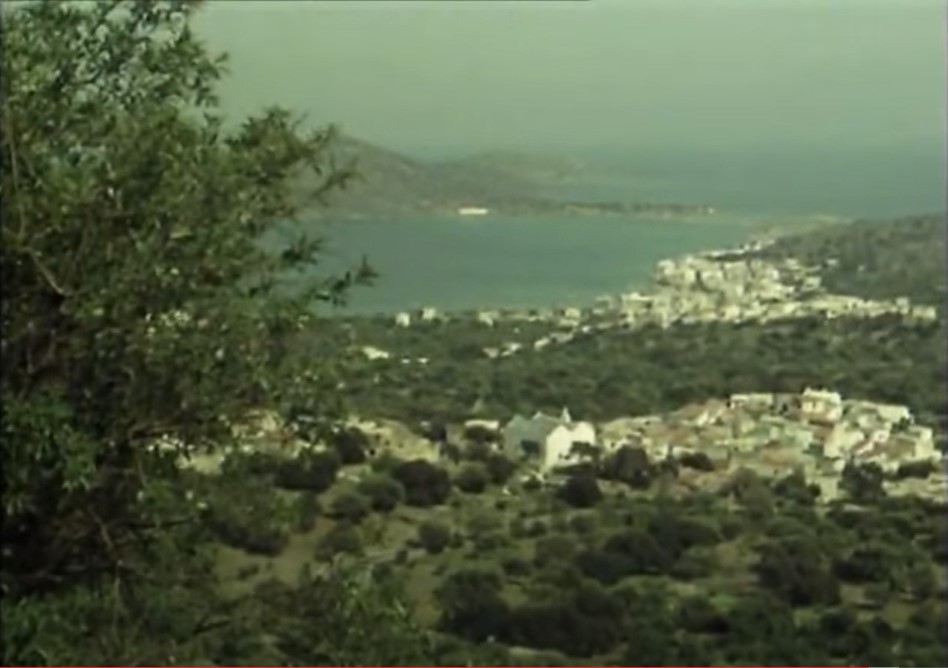 When they stop and Hebden says ‘Elounda’ this static shot of the town is taken from across the harbour.