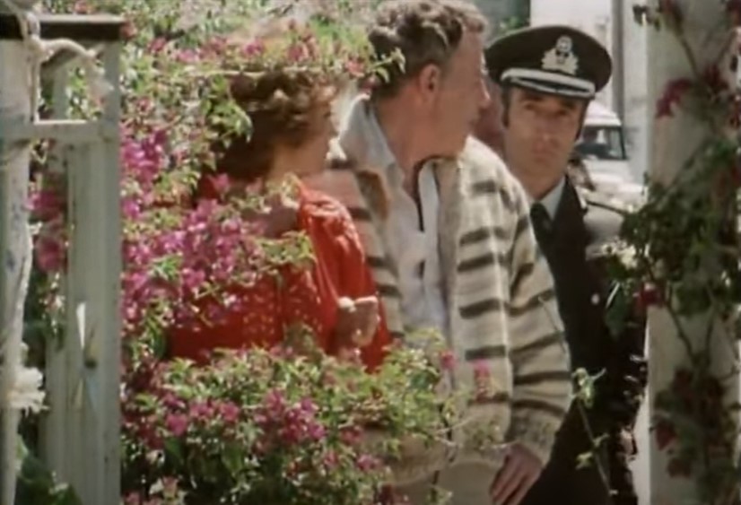 The next scene with Hebden is strangely shot however. In the first scene when Hebden is lighting his cigar, they’re sitting at the tables at the taverna and Jo has her back to it. You can tell this because the taverna is recognisable from the windows and empty space next to it, with the white building where Haldane’s apartment is located next door.