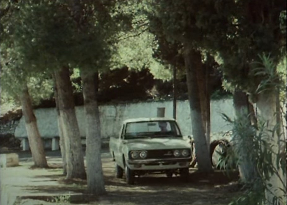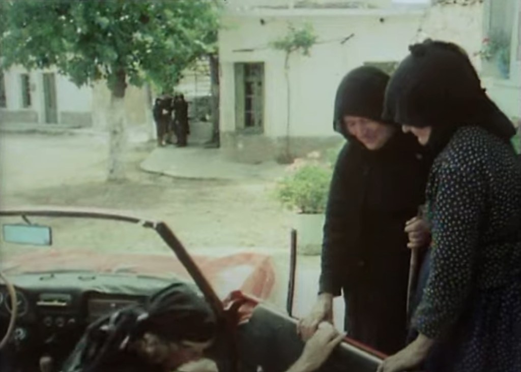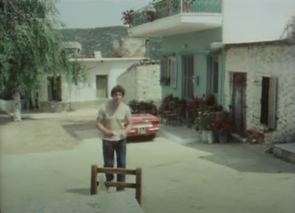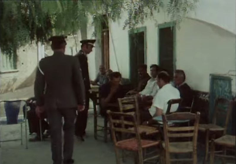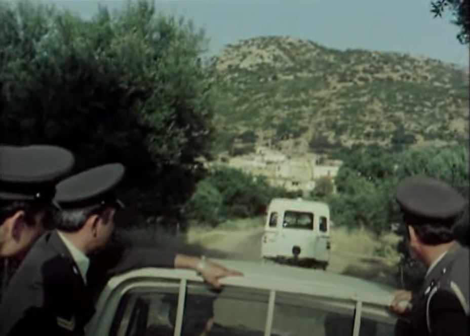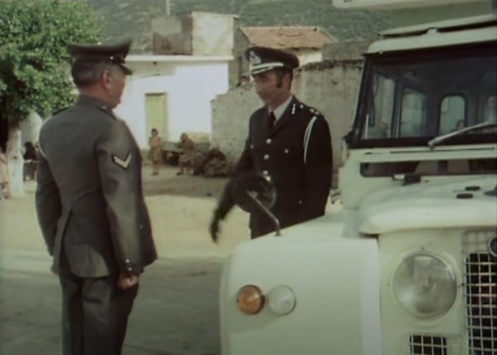 Meanwhile, Major Krasakis visits the village to find out what has happened. Here, the Land Rover is parked outside the restaurant. The big diagonal wall directly behind the Major is still there today – it’s visible in the first Street View image above, next to the house Haldane and Annika park outside. He then goes to see Haldane and check up on how Viglis is doing.