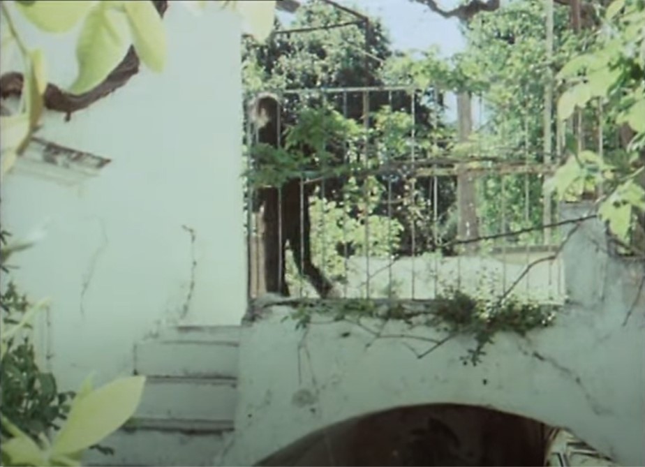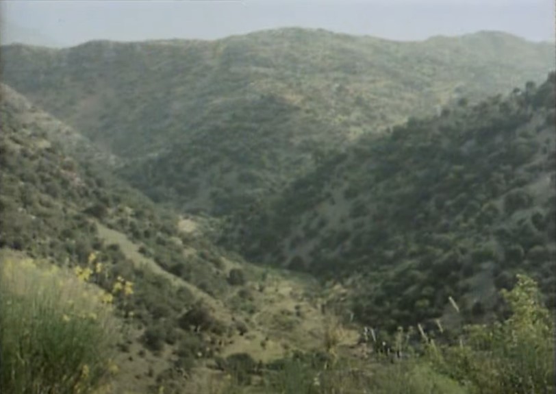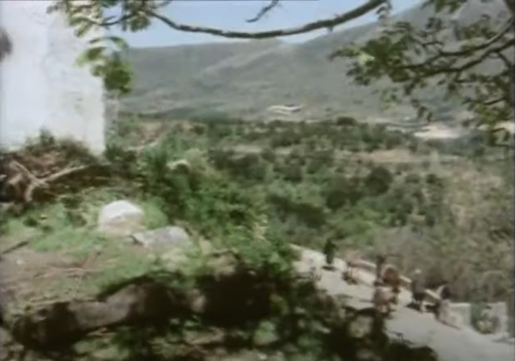 Major Krasakis goes to see Katerina Matakis to warn her about starting any trouble at the funeral. The external shots are of course, from the Kremasta Monastery near Vryses. This panning shot was taken from the monastery starting pointing north at the mountains across the valley, then round to the left till the monastery was in shot.