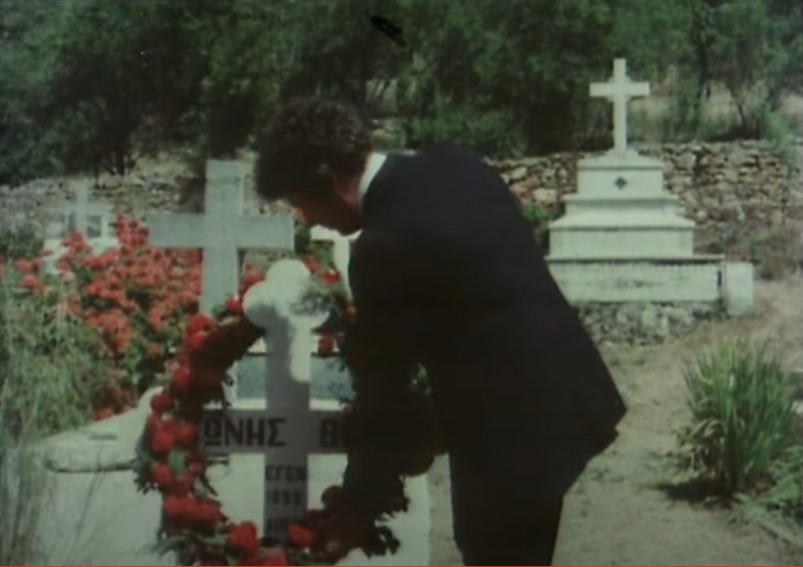 The end credits follow on from Viglis placing a wreath over the cross on his grandfather’s grave. The camera pans to the right slightly as Viglis walks out of shot.