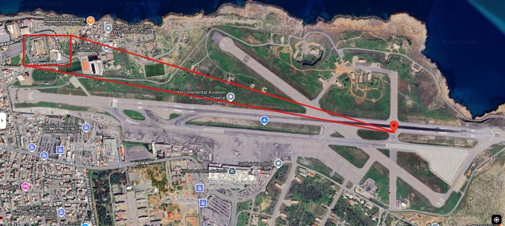 This is Nea Alikarnassos Prison. The pin in the below photo is where I believe the camera was set up to capture the landing. As you can see below, this intersection was part of the old runway 18-36 (north-south).