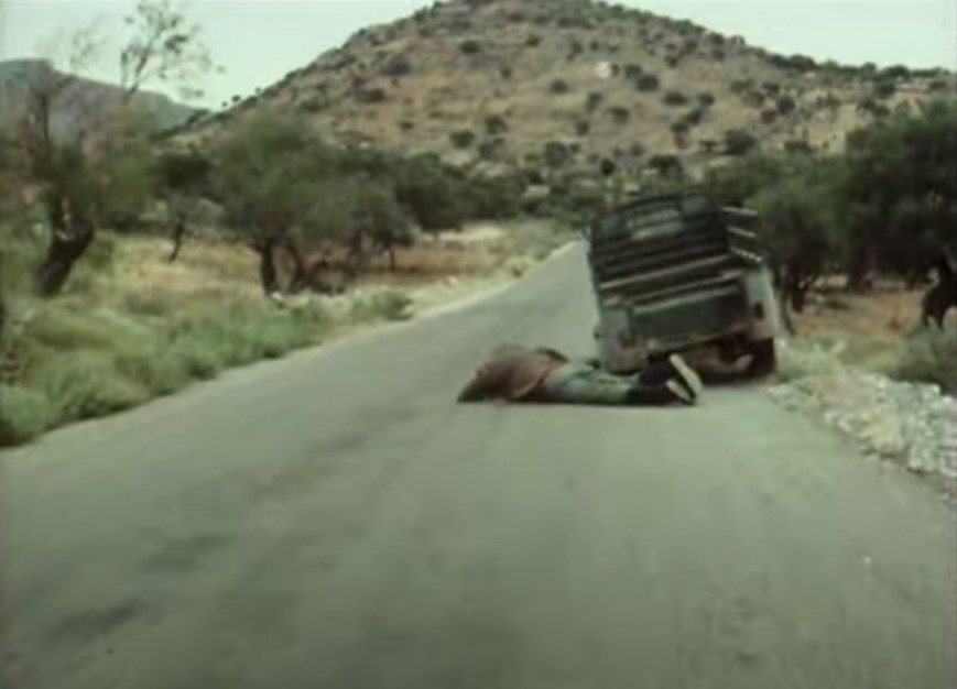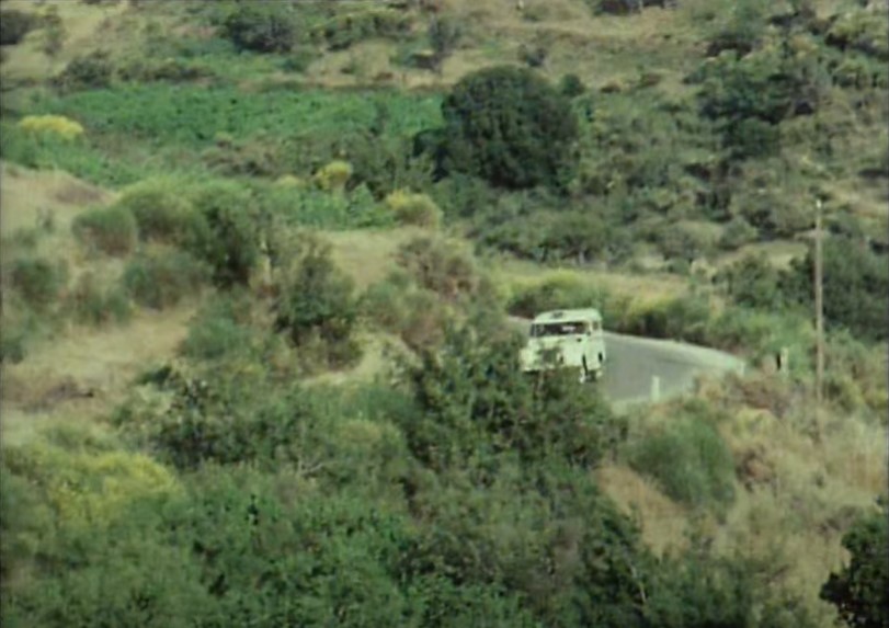 This road appears twice – above, where the Police and Cooper are driving to Meligala, and later on again after they’ve picked up Neve and are returning to Elounda, travelling the other way. The latter scene of the Land Rover driving the other way zooms out slightly, and gives us a clearer picture of where this was shot from: