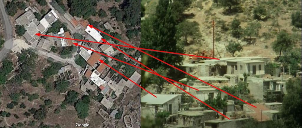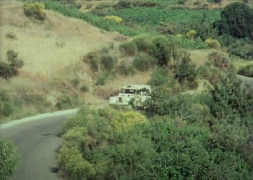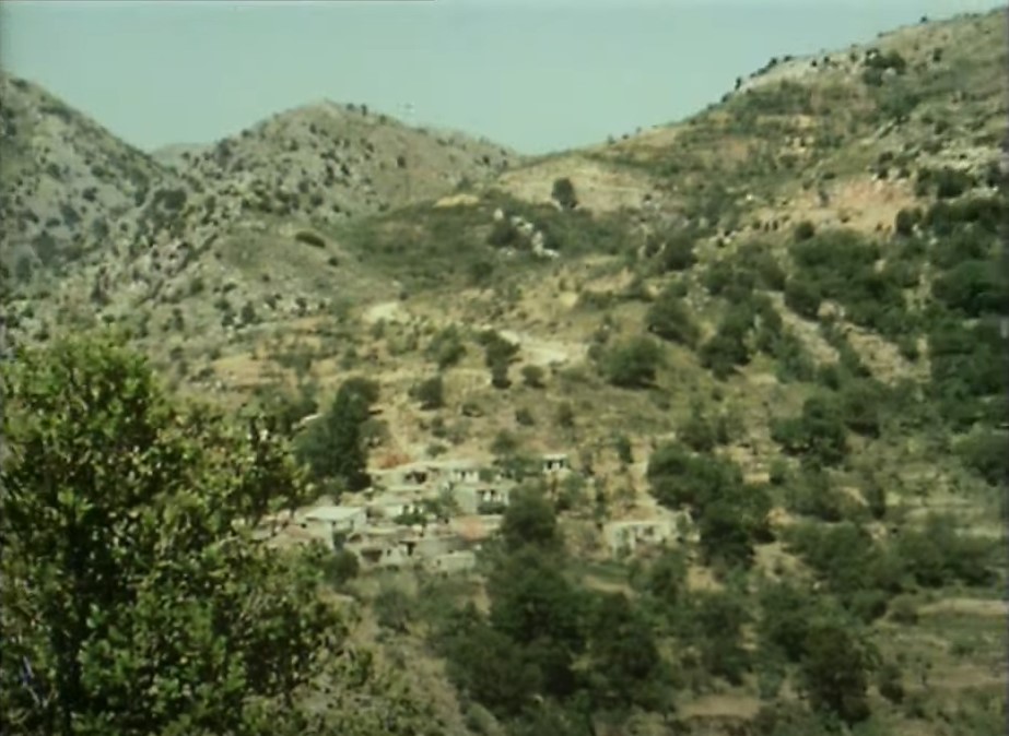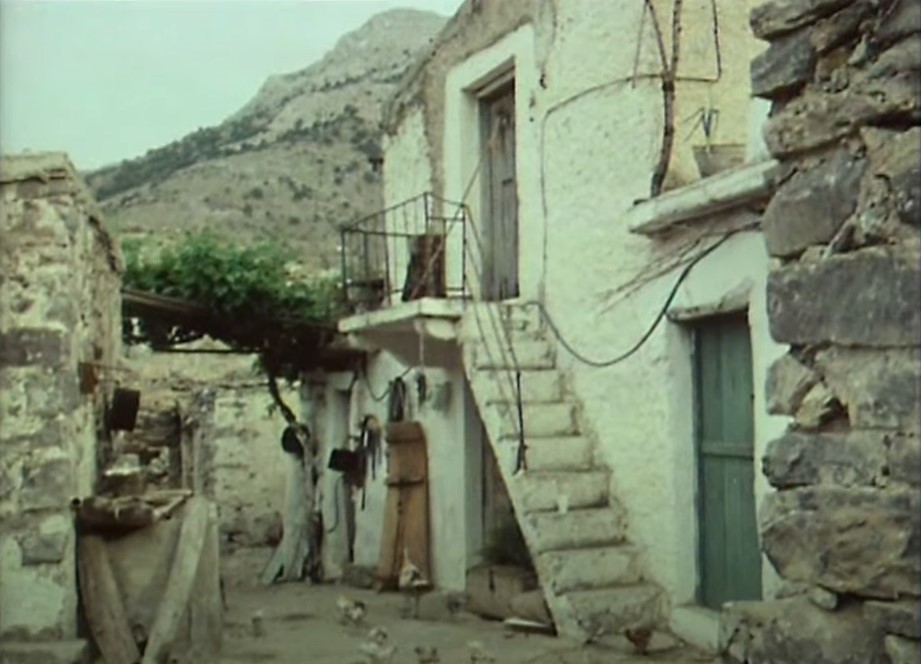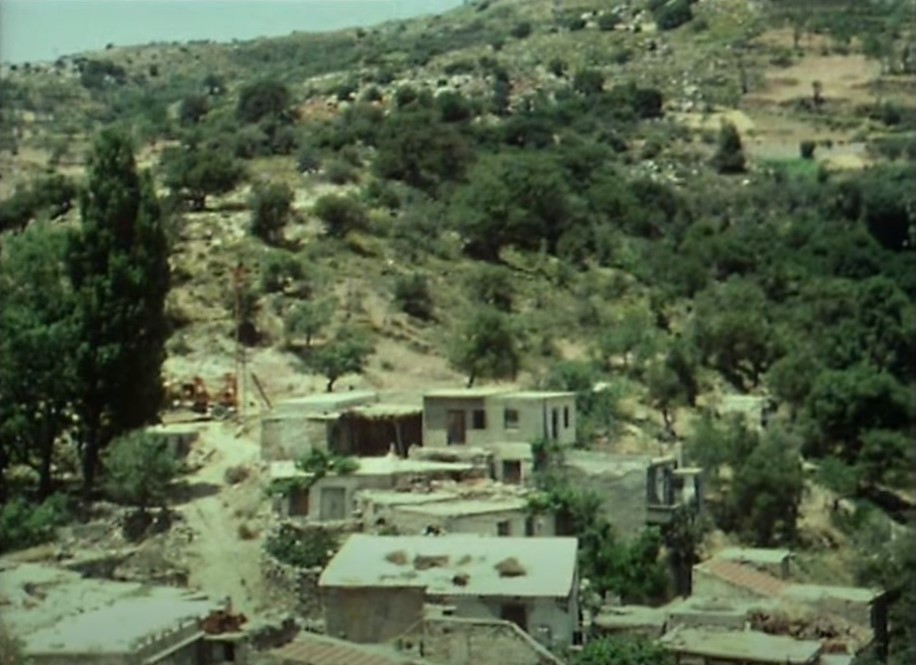 Haldane drives Kingsley home, to a place called ‘Meligala’. Although, do a search for this place in Crete and Google won’t return any results. This is an initial long shot of the village.