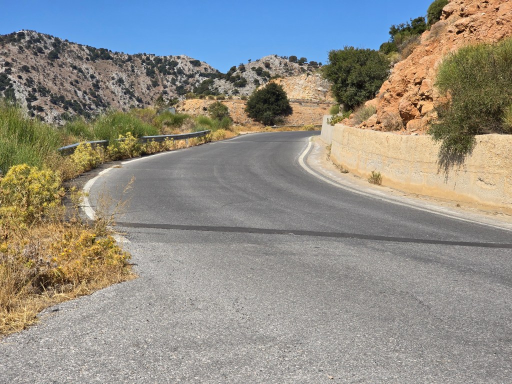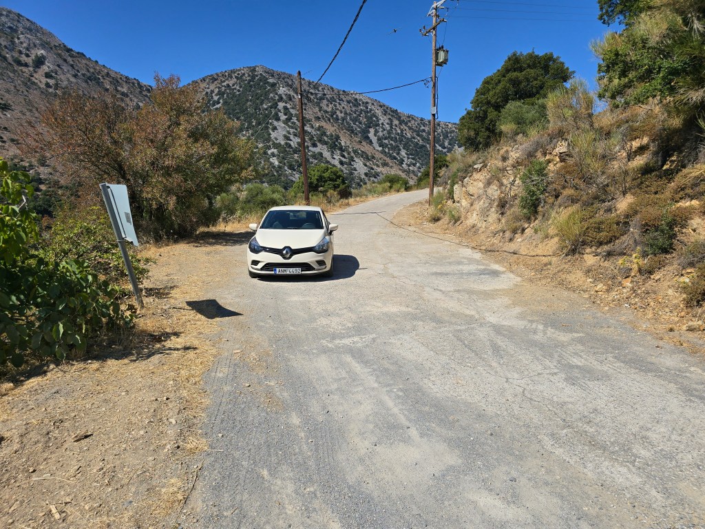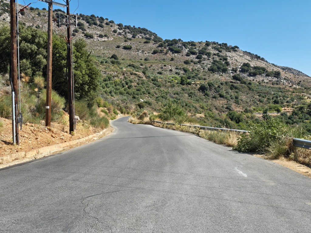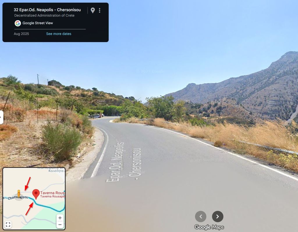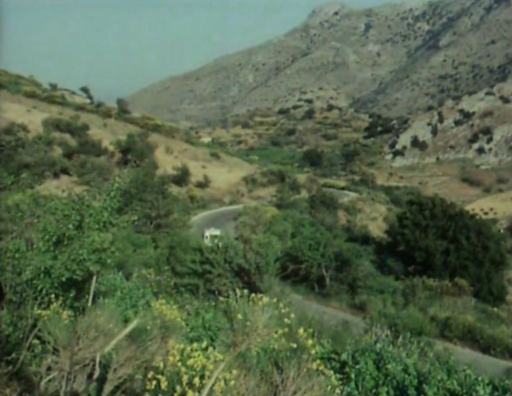 From this view, we see 2 large hills in the valley between the road and the mountain in the distance with the distinctive dome feature. This is actually the main road called the Neapolis to Hersonnisos road – travel eastbound and you reach Ano Amigdaloi which was where Haldane was driving the Opel in the first episode, travel westbound and you reach the location where Haldane and Annika are driving to Dafnai in episode 4. The camera position for these shots was on a slip road that goes higher up the mountain behind the main road: